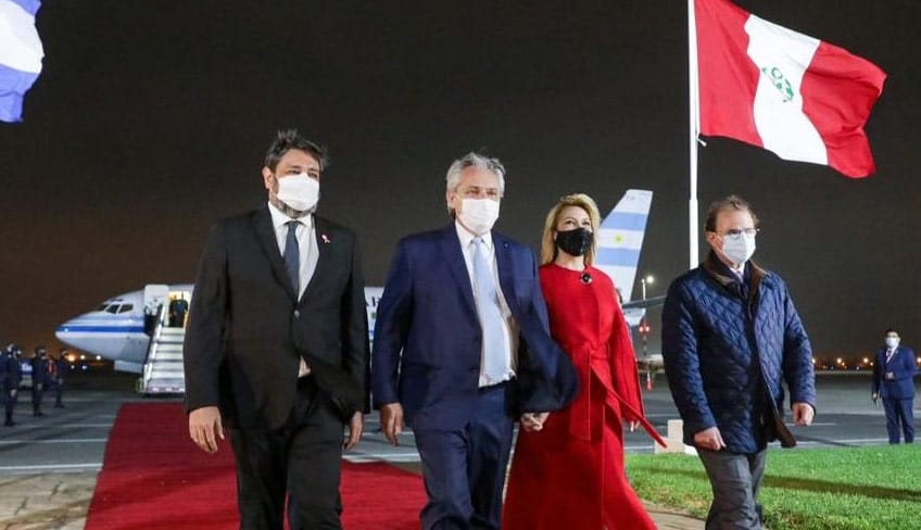 Fernández asistió este jueves en Perú del acto de jura del flamante presidente de ese país, Pedro Castillo. El Jefe de Estado argentino estuvo acompañado por la Primera Dama, Fabiola Yañez; el Canciller, Felipe Solá; la Ministra de Mujeres, Géneros y Diversidad, Elizabeth Gómez Alcorta; los Secretarios General de la Presidencia, Julio Vitobello, y de Comunicación y Prensa, Juan Pablo Biondi; y el Diputado Nacional, Eduardo Valdés, Titular de la Comisión de Relaciones Exteriores de la Cámara baja.