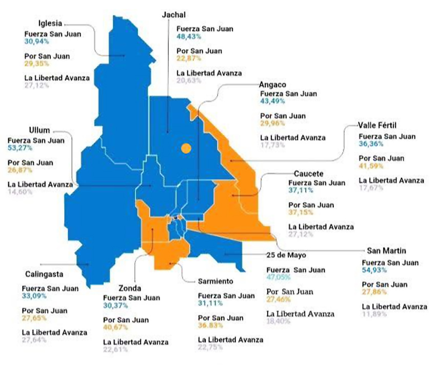 Por su parte, La Libertad Avanza obtuvo una victoria en la Ciudad de San Juan, y se quedó con el 34,58% de los votos, dejando atrás al peronismo y a Producción y Trabajo.