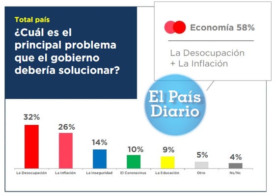 El punto débil del peronismo es la situación económica que atraviesa Argentina. El oficialismo debe atender ese tema y ponerse en alerta, porque la reactivación de la economía es un problema fundamental en casi el 60% de los encuestados.