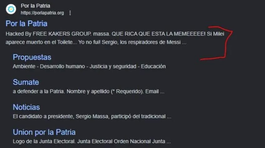 "Hacked By FREE KAKERS GROUP", era el mensaje que aparecía al buscar este viernes la página de Unión por la Patria en Google. Debido a que estas formas de hackear son muy sofisticadas, hasta el momento no se sabía quién o quienes están detrás de los ciberataques, perpetrados a dos días del balotaje.
