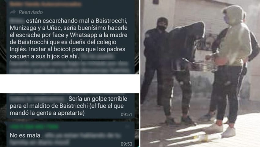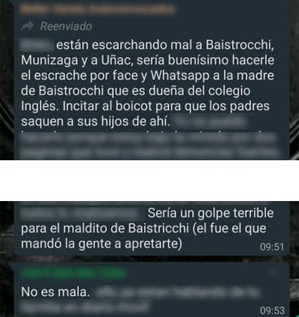 Allí plantean seguir con escraches personalizados. Y eso no está bien. Hay que parar con esa práctica, porque nos está yendo mal con eso. En el grupo de Whatsapp, una de sus integrantes propone: "Sería buenísimo hacerle un escrache por face y Whatsapp a la madre de Baistrocchi que es dueña del colegio Inglés. Incitar al boicot para que los padres saquen a sus hijos de ahí".