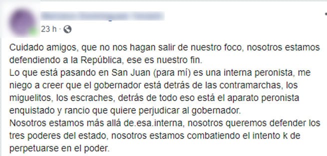 Hace poco leí en el muro de una ciudadana autoconvocada un razonamiento que me pareció lógico. Dice así: "Cuidado amigos, que no nos hagan salir de nuestro foco, nosotros estamos defendiendo a la República, ese es nuestro fin. Lo que está pasando en San Juan (para mí) es una interna peronista, me niego a creer que el gobernador está detrás de las contramarchas, los miguelitos, los escraches, detrás de todo eso está el aparato peronista enquistado y rancio que quiere perjudicar al gobernador".