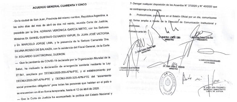 Con la firma digital de los cinco miembros del máximo tribunal, la Acordada 17/2020 dispuso el funcionamiento pleno y presencial, aunque con todos los recaudos y protocolos sanitarios, del sistema de justicia en Corrientes y Tucumán.