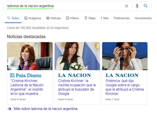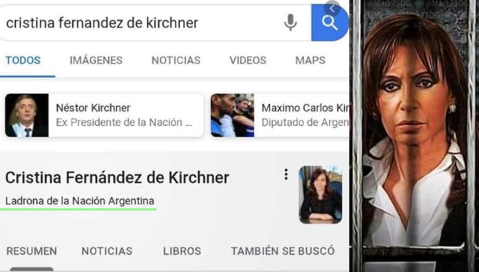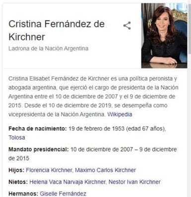 "Como saben, el 17 de mayo Google publicó información falsa y ofensiva contra mi persona, provocando un daño que debe ser reparado", manifestó la expresidenta Jefa de una Banda de Cacos que saqueó al país durante una década. Más tarde aseveró: "Cuando las mentiras y difamaciones se disparan desde plataformas masivas, su circulación no tiene límites, no se puede detener y el daño que ocasionan a los difamados pareciera ser incalculable". (Ver nota aparte).