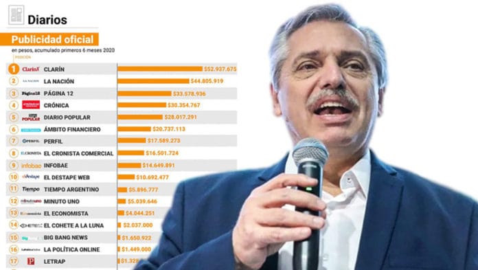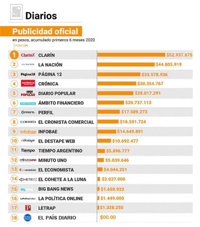 Le siguen La Nación con casi $44,8 millones, Página/12 y Crónica con $33,5 millones cada uno, Diario Popular con $28 millones, Ámbito Financiero con $20,7 millones, Perfil con $17,5 millones, El Cronista Comercial con $16,5 millones, Infobae con $14,6 millones, El Destape Web con $10,6 millones, Tiempo Argentino con $5,8 millones, Minuto Uno con $5 millones, entre otros. Al final se ubica El País Diario con $00.00.