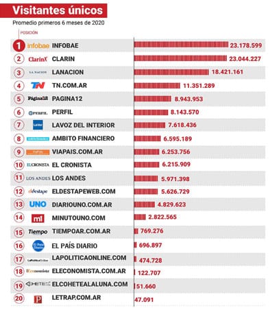 Según Comscore, Infobae registró en el primer semestre un promedio de 23,1 millones de visitantes únicos mensuales solamente en Argentina. Además, ganó cuatro de los primeros seis meses del año. Sus principales competidores son Clarín, que promedió casi 23 millones y La Nación, con 18,4 millones.