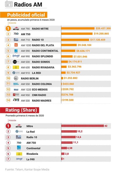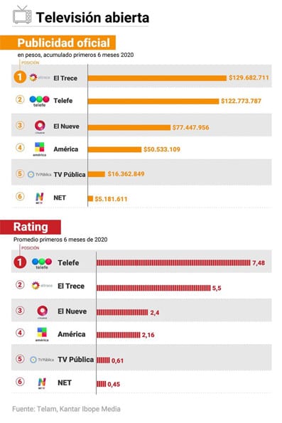 En los primeros seis meses del 2020, Canal Trece, la emisora del Grupo Clarín, recibió casi $130 millones, Telefé pelotitas $123 millones, El Nueve otros $77,5 millones, América $50,5 millones, la TV Pública $16,3 millones, y la nueva señal de editorial Perfil, Net, $5,3 millones.