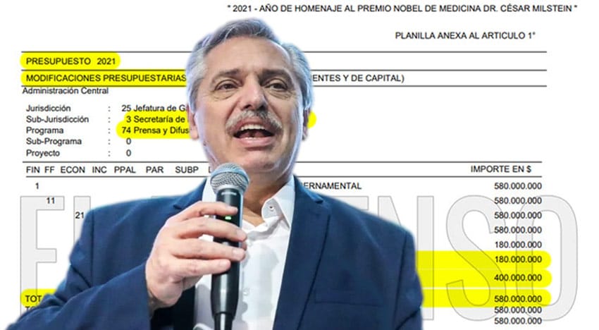 De acuerdo a la planilla presupuestaria que lleva el aval del Ministro de Economía, Martín Guzmán, los 580.000.000 serán distribuidos en 400.000.000 para Pauta Oficial y 100.000.000 para Estudios e investigaciones.